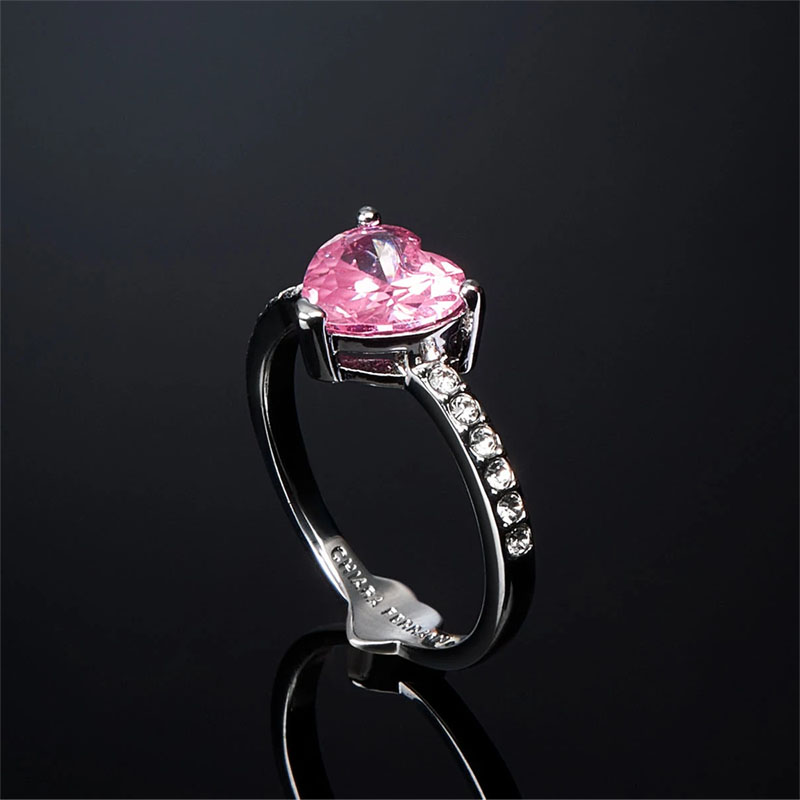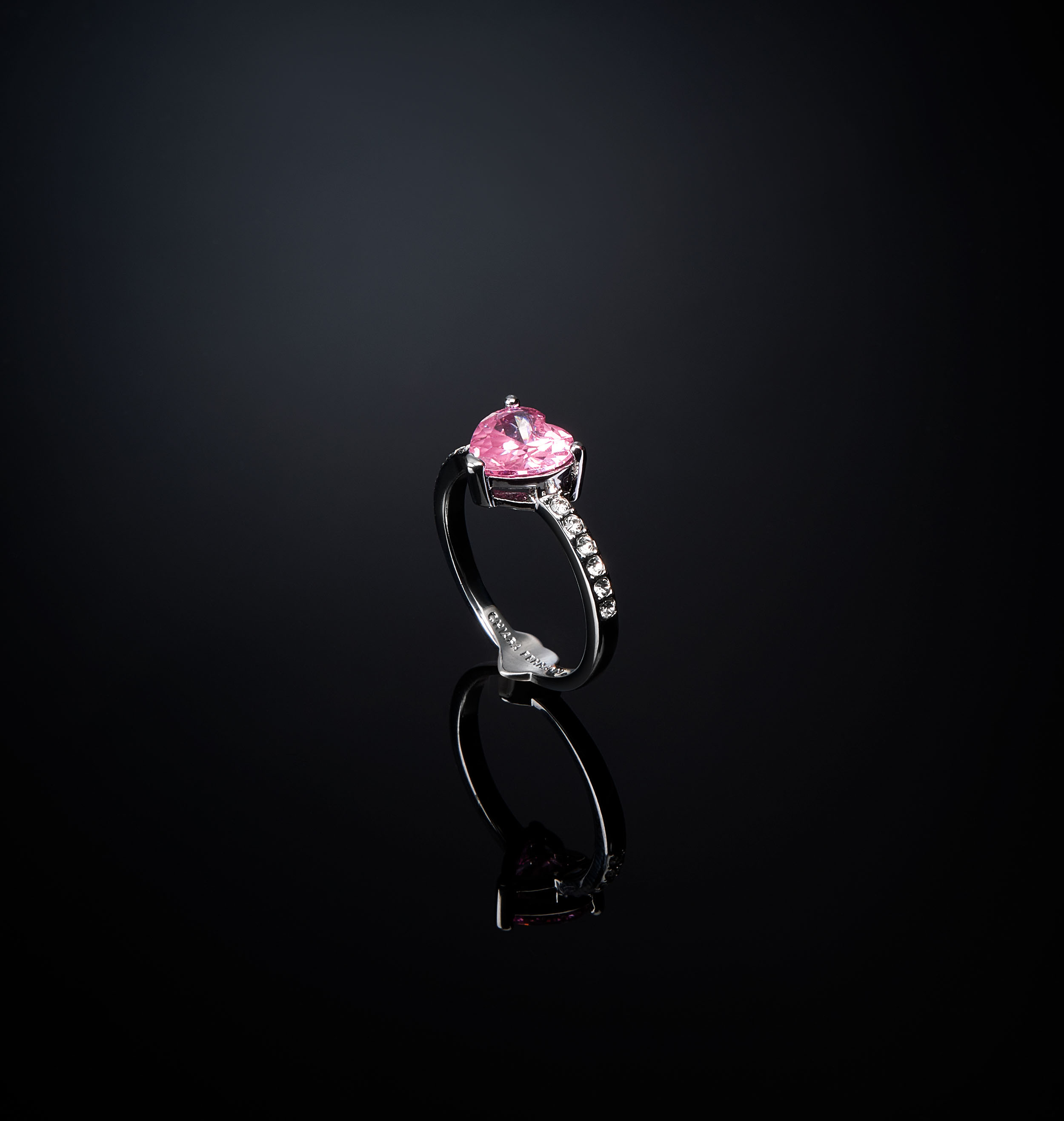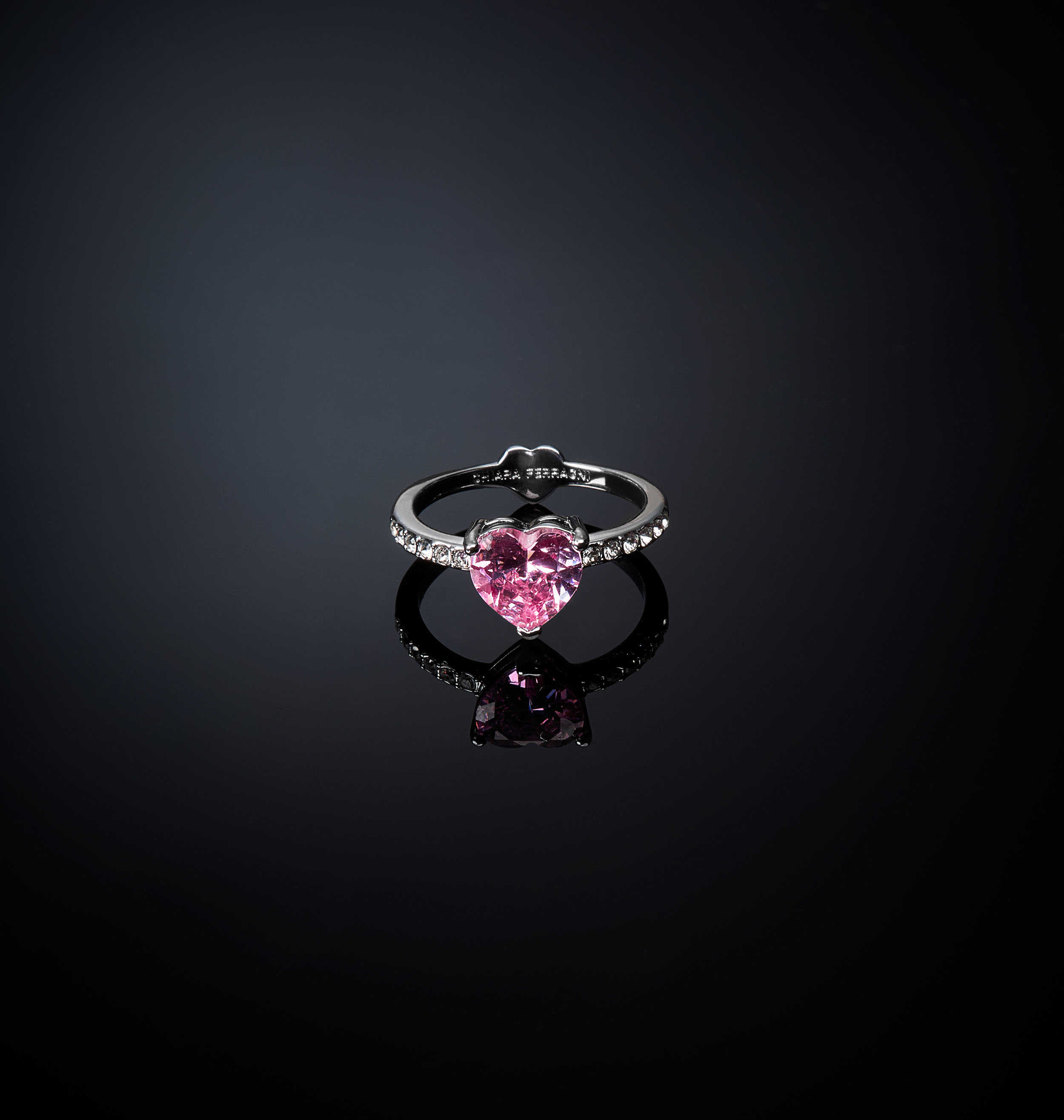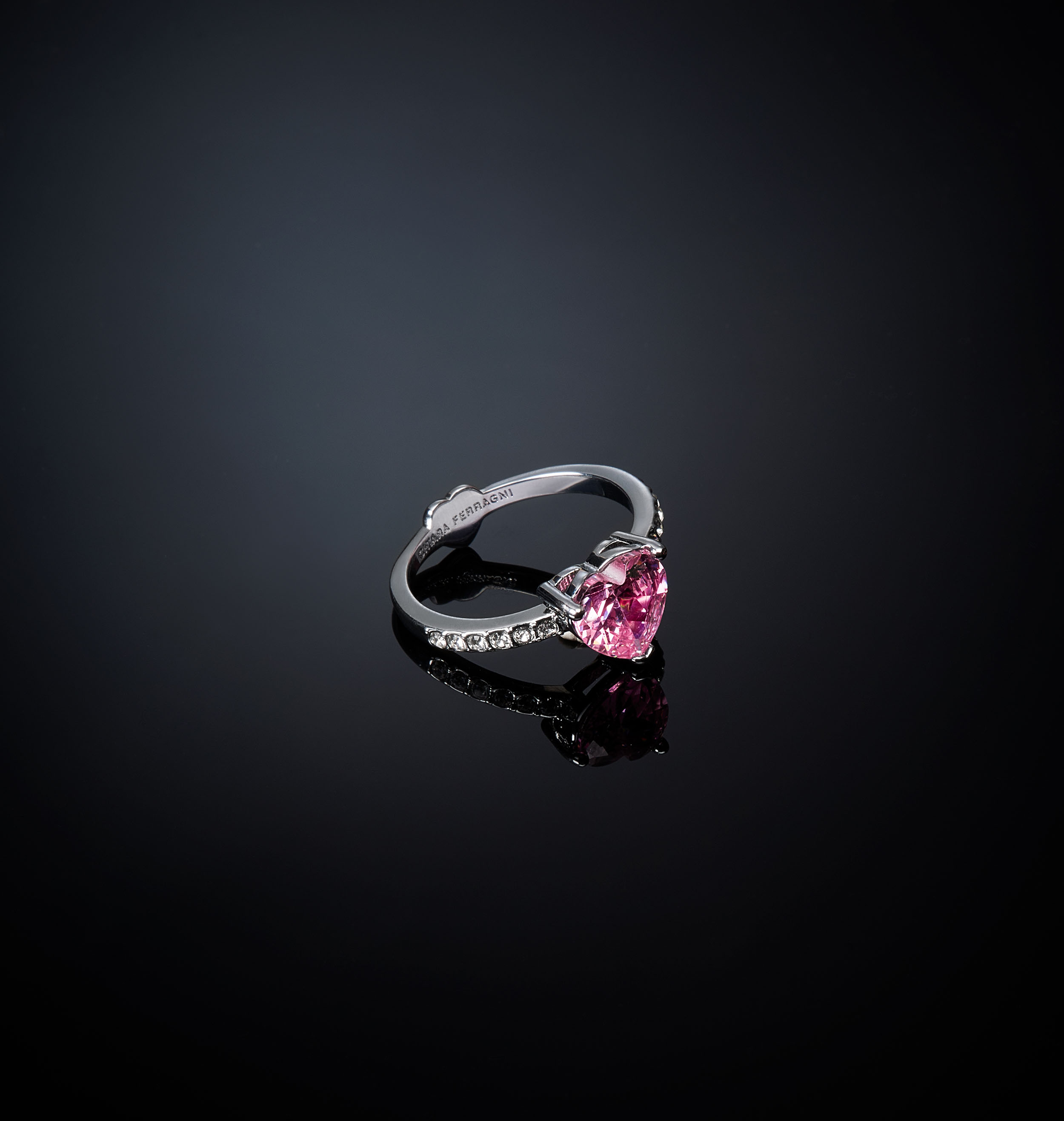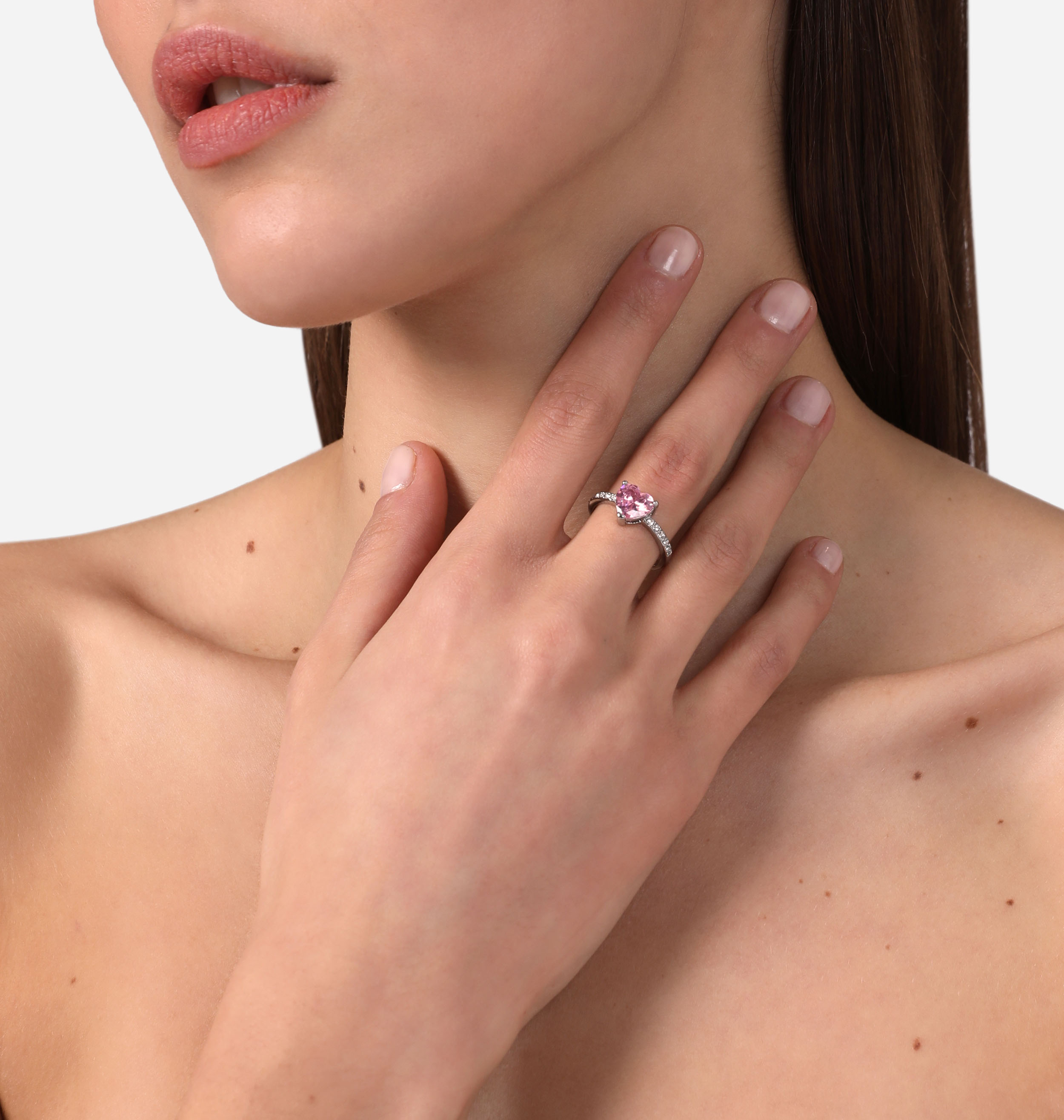 Anello realizzato in Rodio, con Zircone Rosa Centrale a Forma di Cuore e pavè di Zirconi Bianchi.