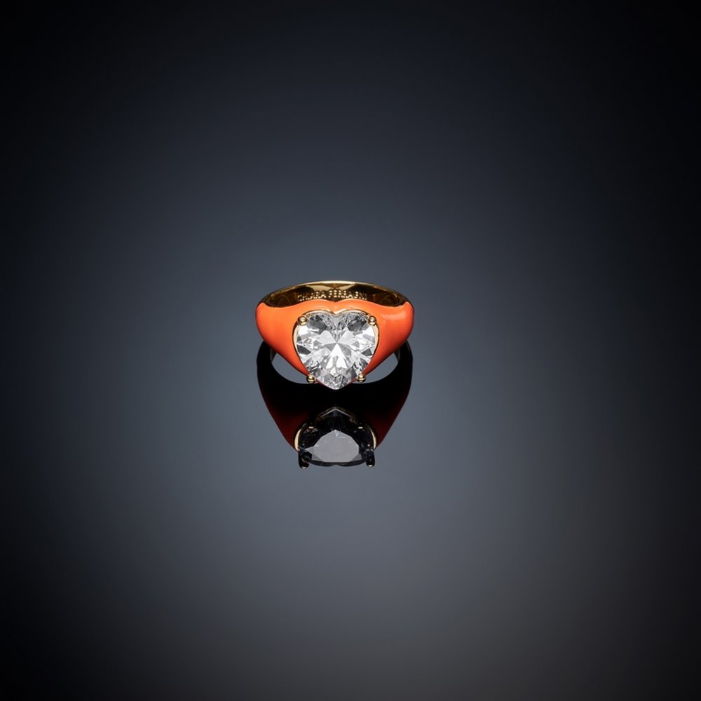 Anello Bold placcato in oro 18 Kt con zircone bianco taglio cuore e smalto arancione.