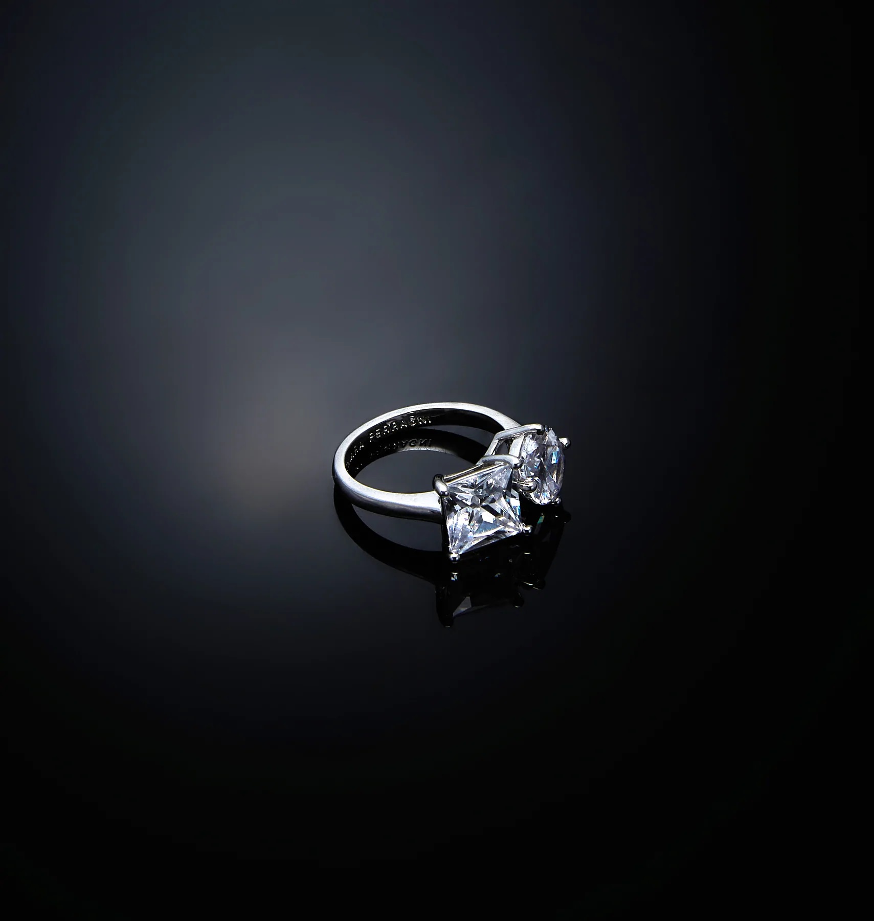 Anello placcato rodio impreziosito da due zirconi luminosi di tagli diversi.