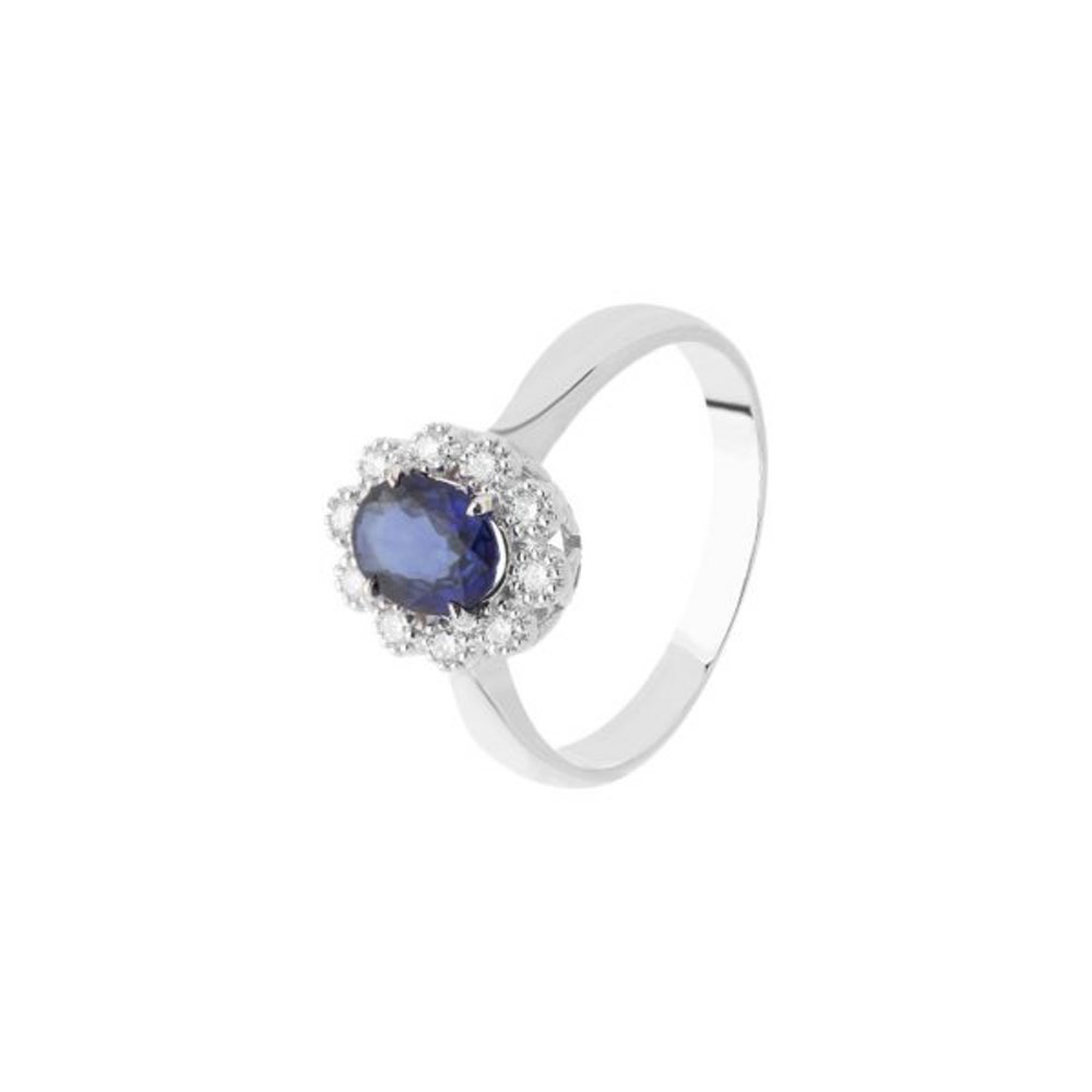 Anello in oro bianco 18 Kt 750/1000 con zaffiro naturale 0.45 ct e diamanti 0.10 ct taglio brillante