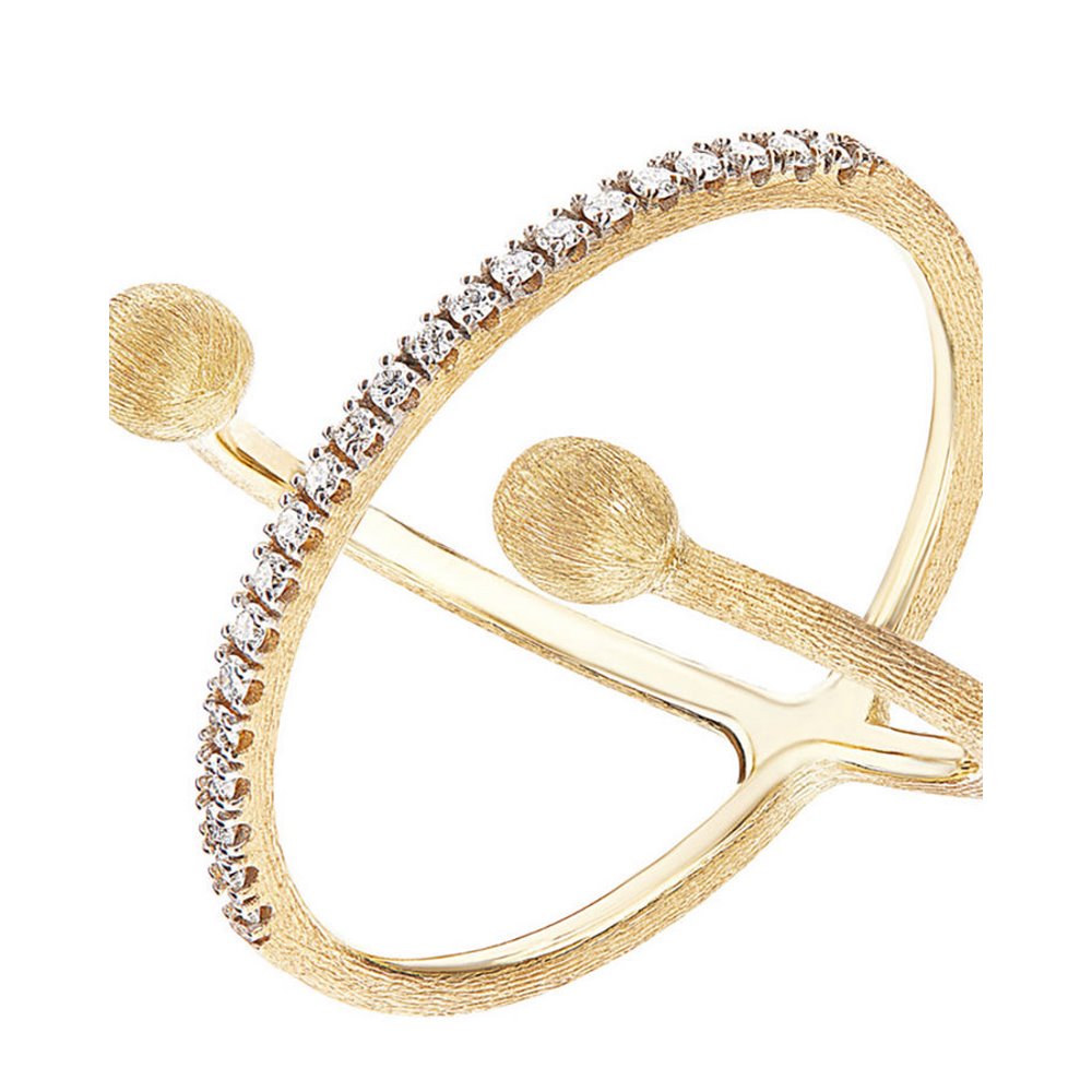 Un’ode all'eleganza che forza le regole, che riscrive con raffinatezza forme e dettagli. I diamanti e l'oro giallo 18kt si rincorrono in questo sofisticato anello ad incrocio, avvolgendo teneramente il dito e facendolo scintillare.