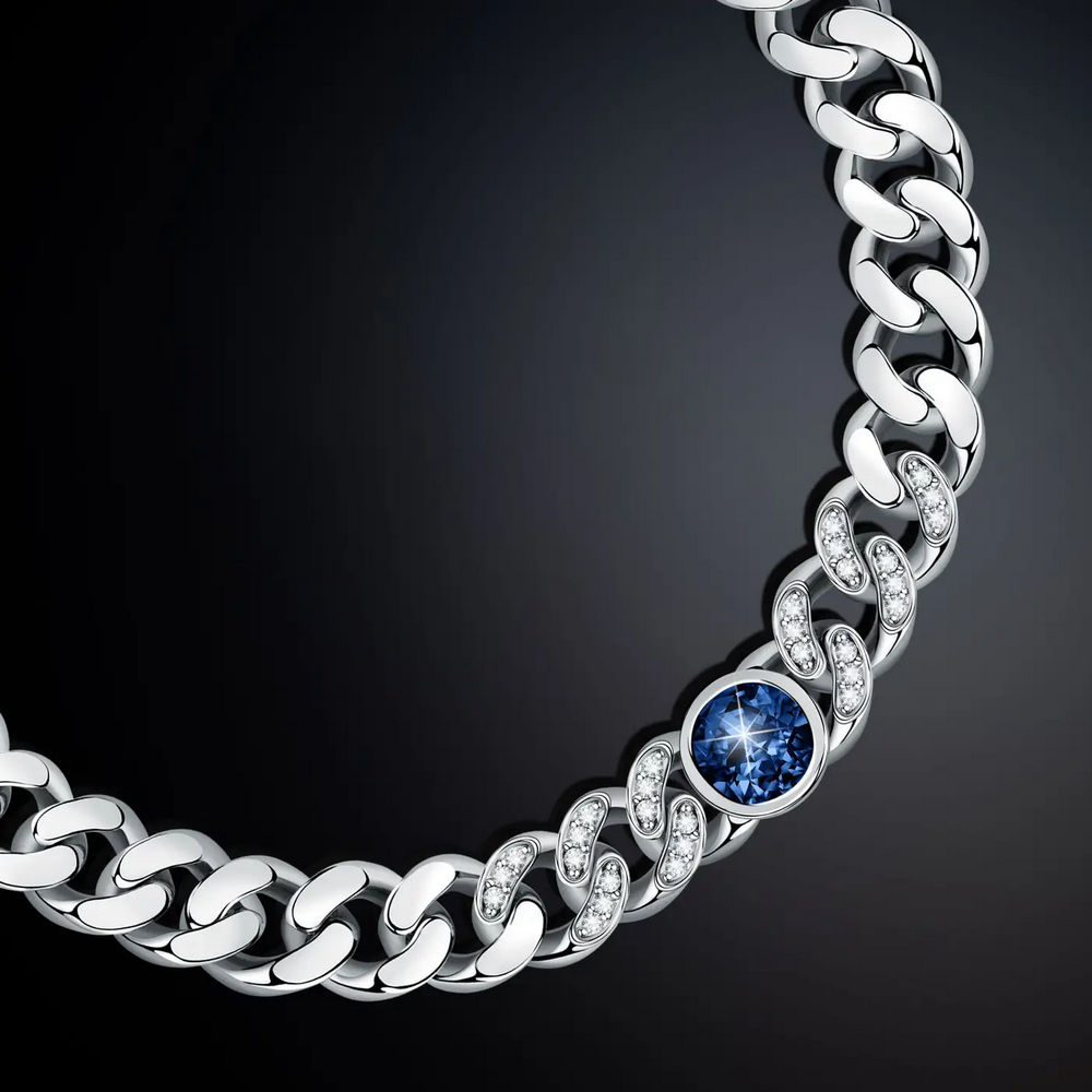 Bracciale da Donna, collezione Chain Chiara Ferragni. Bracciale catena groumette silver, zircone blu zaffiro centrale e pavè di cristalli bianchi.