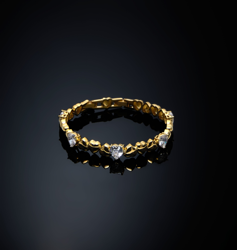 Bracciale placcato oro con 3 pietre centrali a forma di cuore.