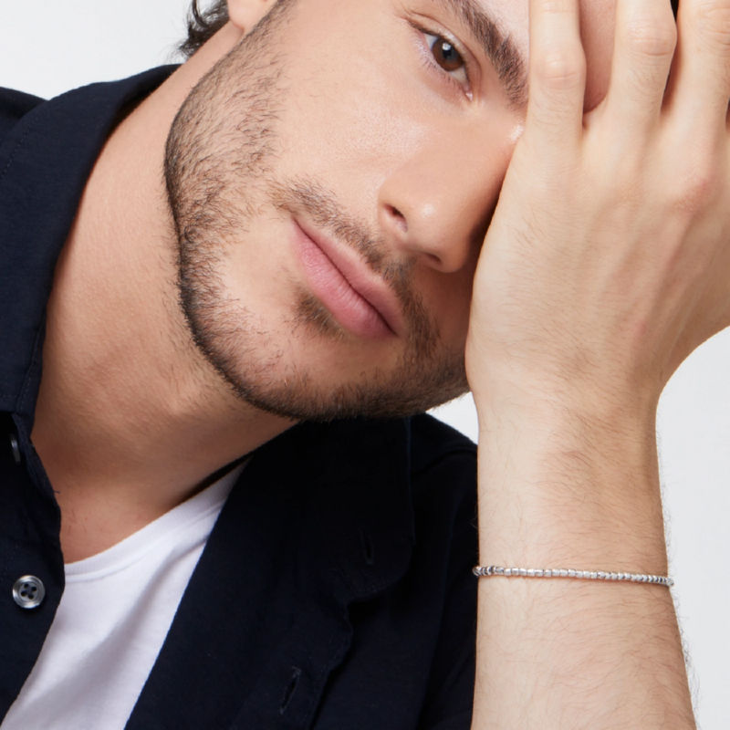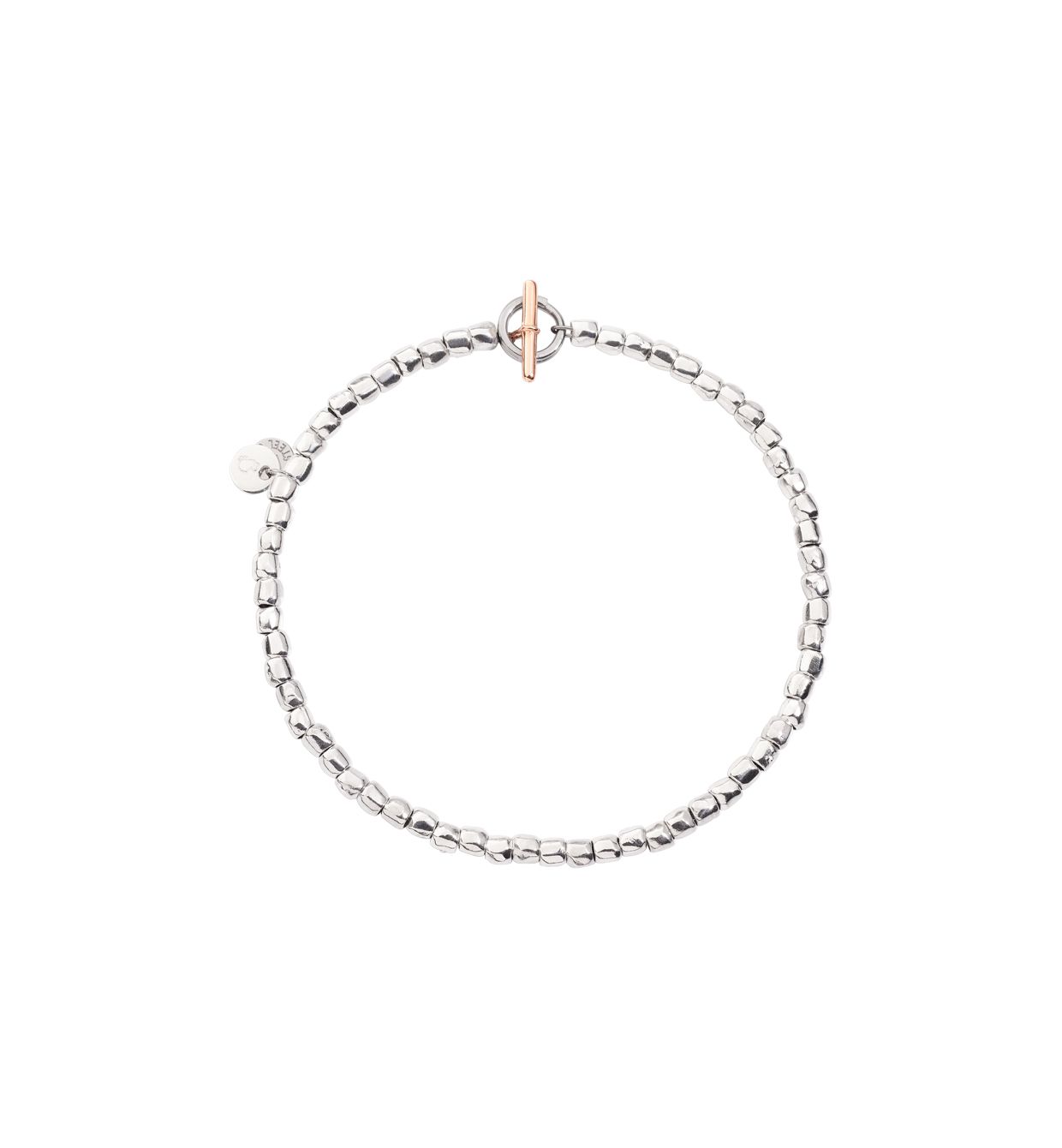 Bracciale con mini granelli in argento, chiusura con barra in oro rosa 9 carati e anello brisè in acciaio. Catenina interna in acciaio. Su questo bracciale sono compatibili solo i ciondoli Mini. Non possono essere usati ciondoli e componenti tradizionali.