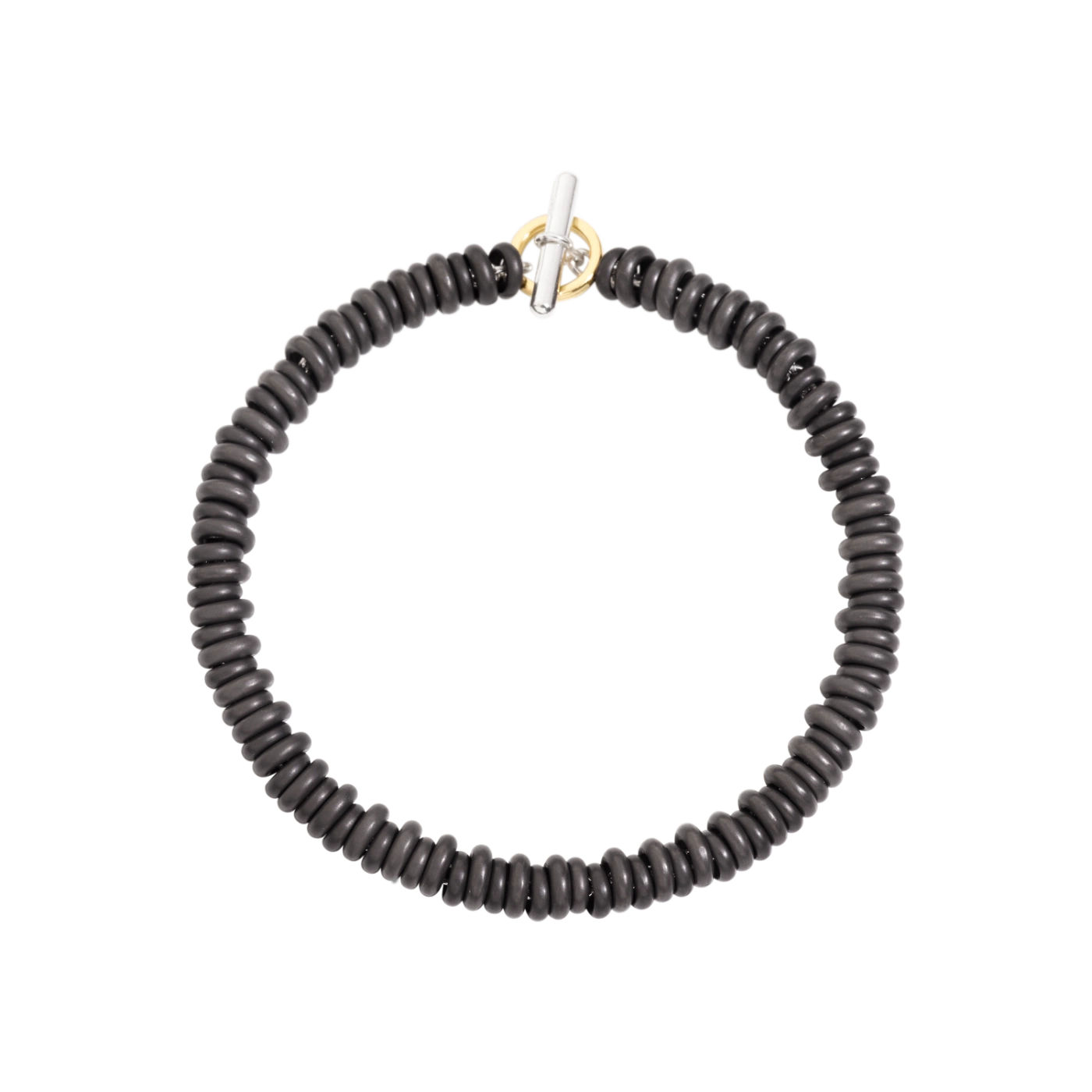 Bracciale rondelle in titanio, catena e t-bar in argento 925 e anello brisè in oro giallo 18K.