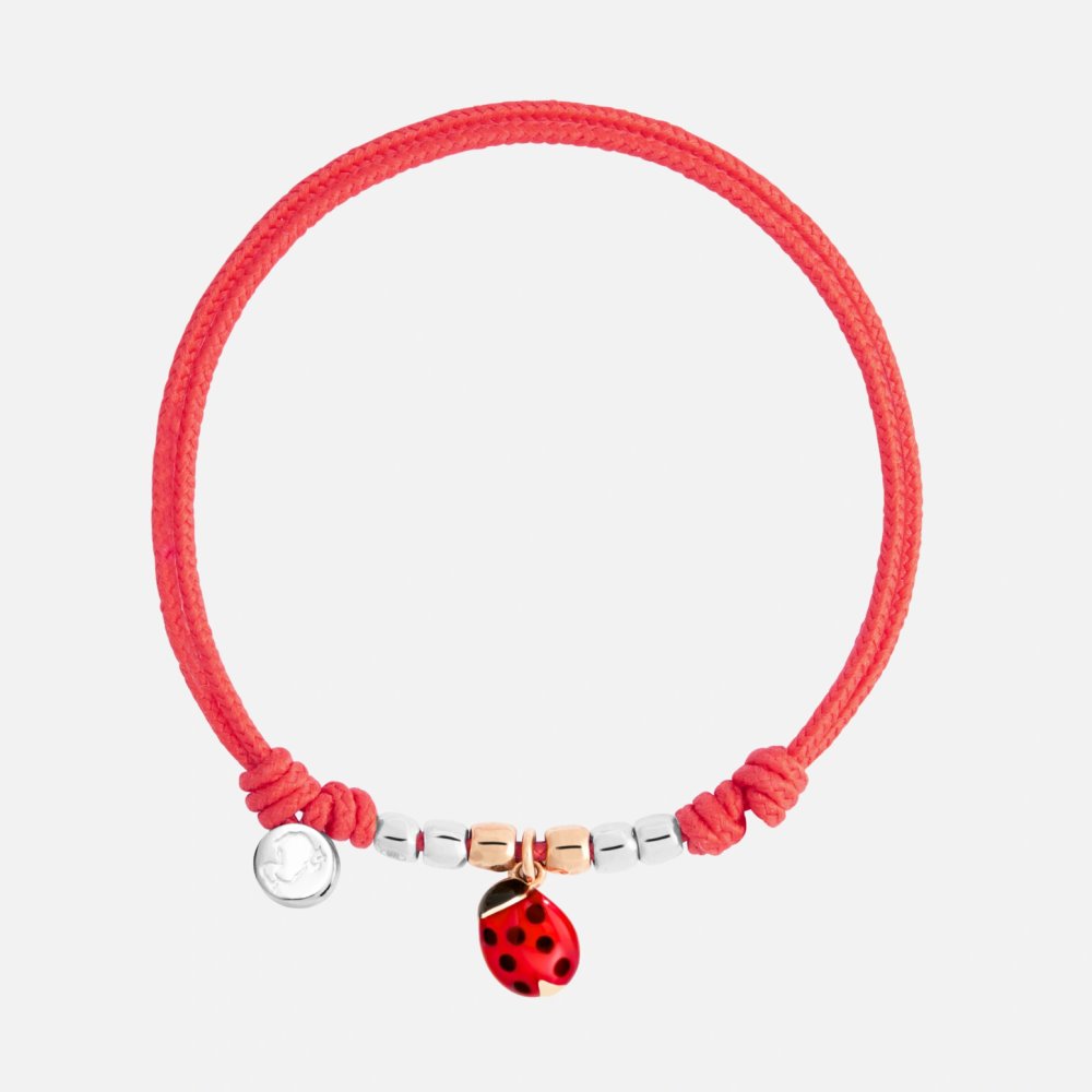 Bracciale con charm Coccinela modello mini in oro rosa 9K e smalto rosso e nero, quattro mini Granelli in argento 925 e due mini Granelli in oro rosa 9K, cordino rosso e sigillo in argento 925.