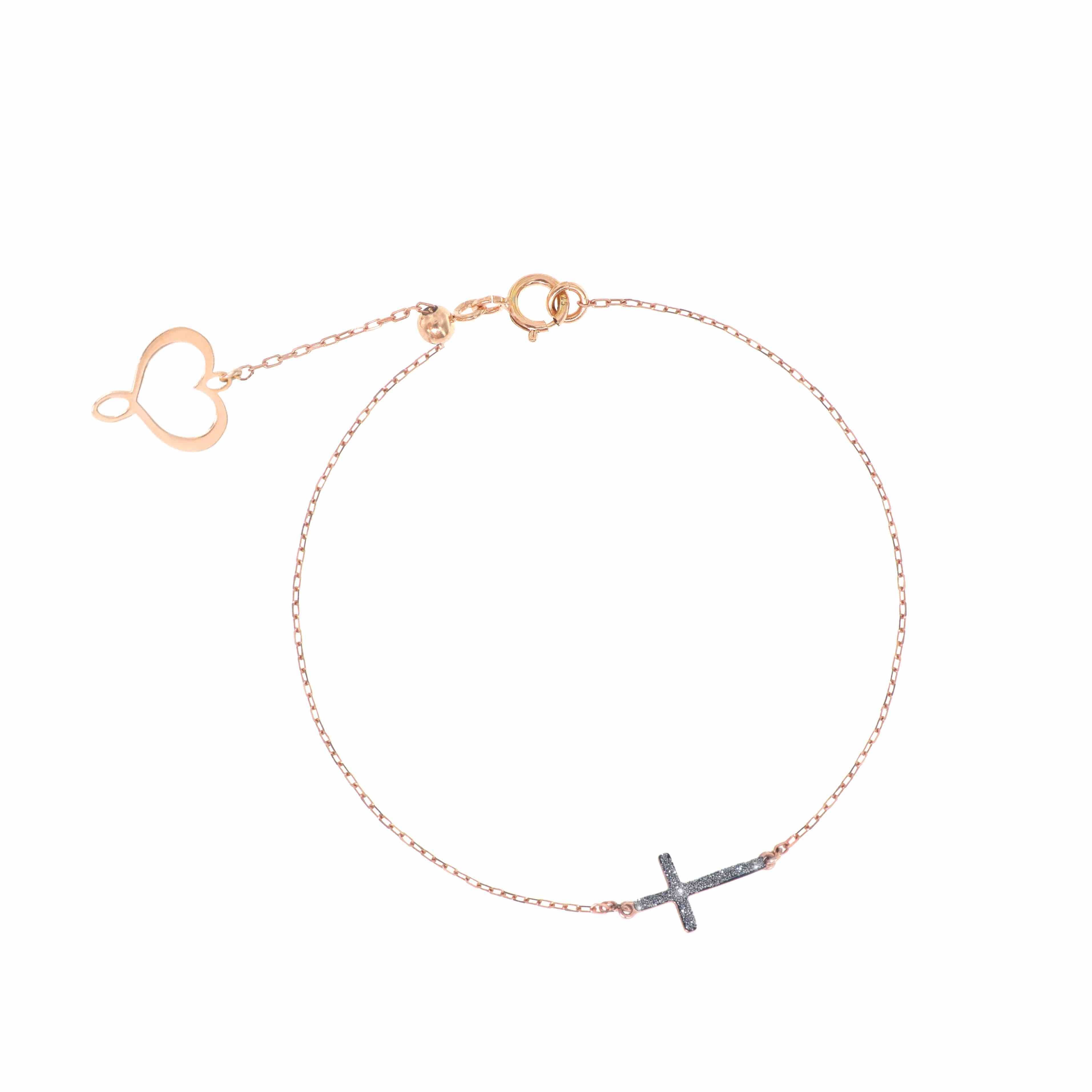 Bracciale Aurum con catena e con sagoma di croce centrale in lastra e micro-polvere di diamanti cromo. Il bracciale è interamente realizzato in oro rosa 18 carati. La croce misura 6,3 mm x 10 mm. La circonferenza è regolabile grazie alla piccola sfera scorrevole, fino ad un massimo di 17 cm. Chiusura con anello circolare a molla.