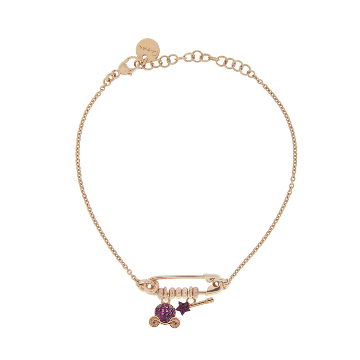 Bracciale catena rosa con spilla e doppio ciondolo micro zirconi colorati.