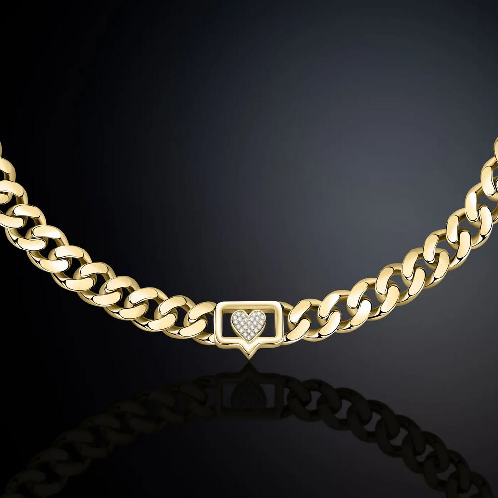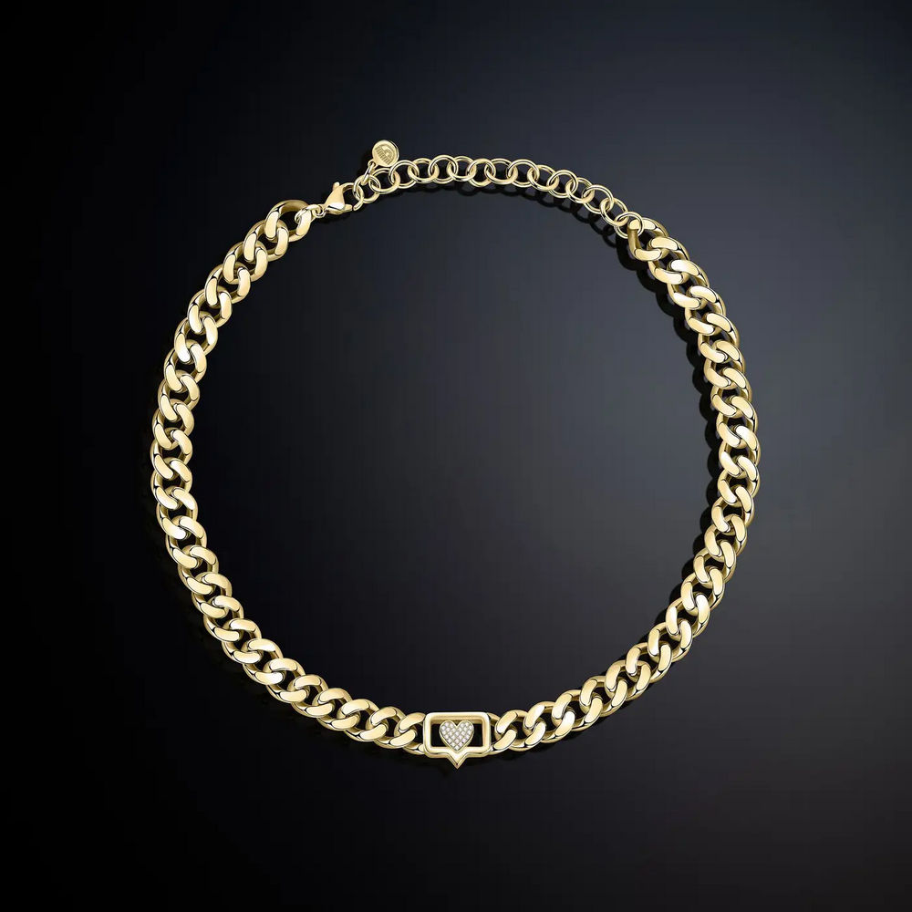 Collana da Donna, collezione Chain Chiara Ferragni. Collana catena groumette placcata oro giallo 18 Kt e logo centrale con pavè di zirconi