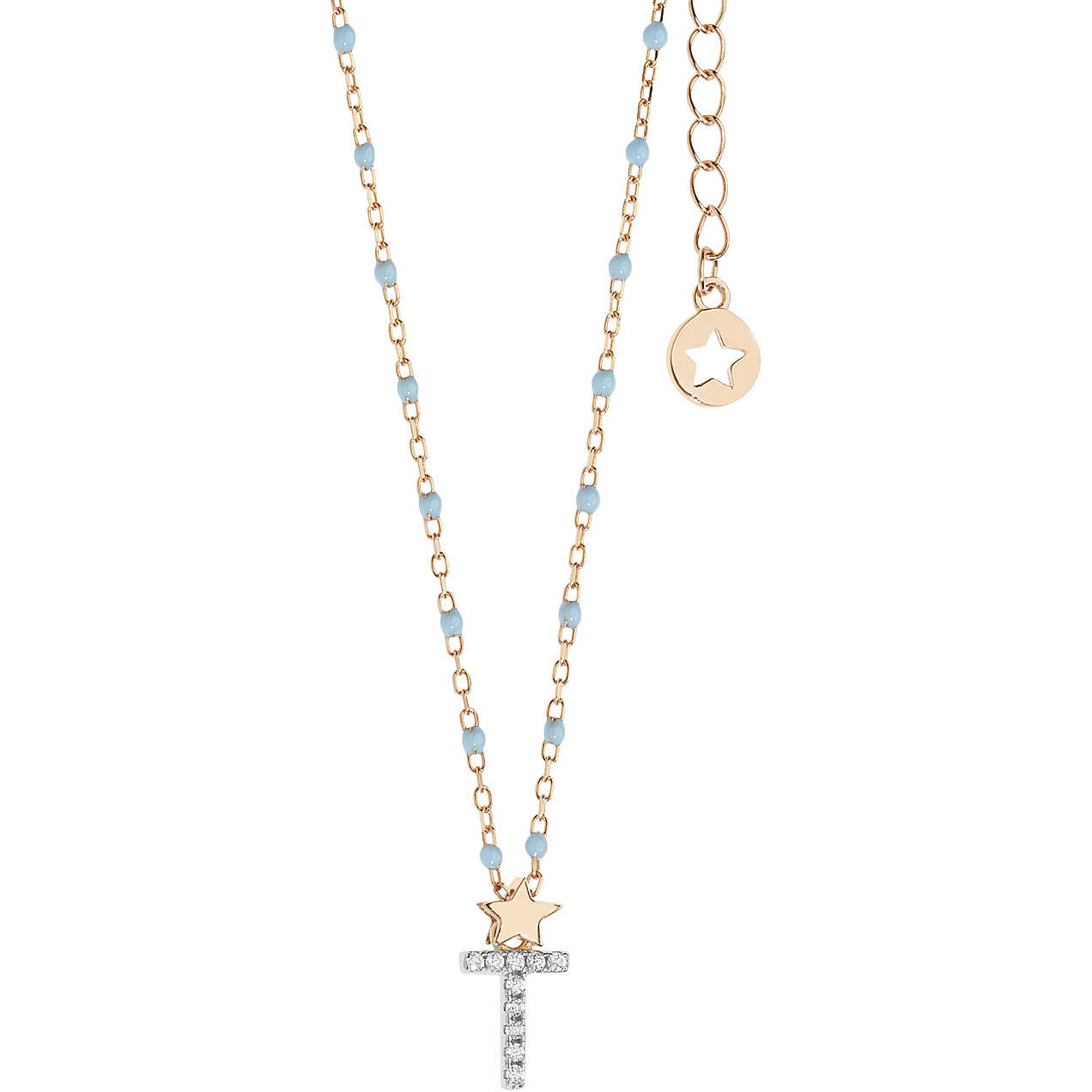 Collana da donna comete realizzata in argento 925% placcato oro rosa e sfere con smalto azzurro.