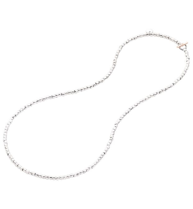 Collana con mini granelli in argento, chiusura con barra in oro rosa 9 carati e anello brisè in acciaio.