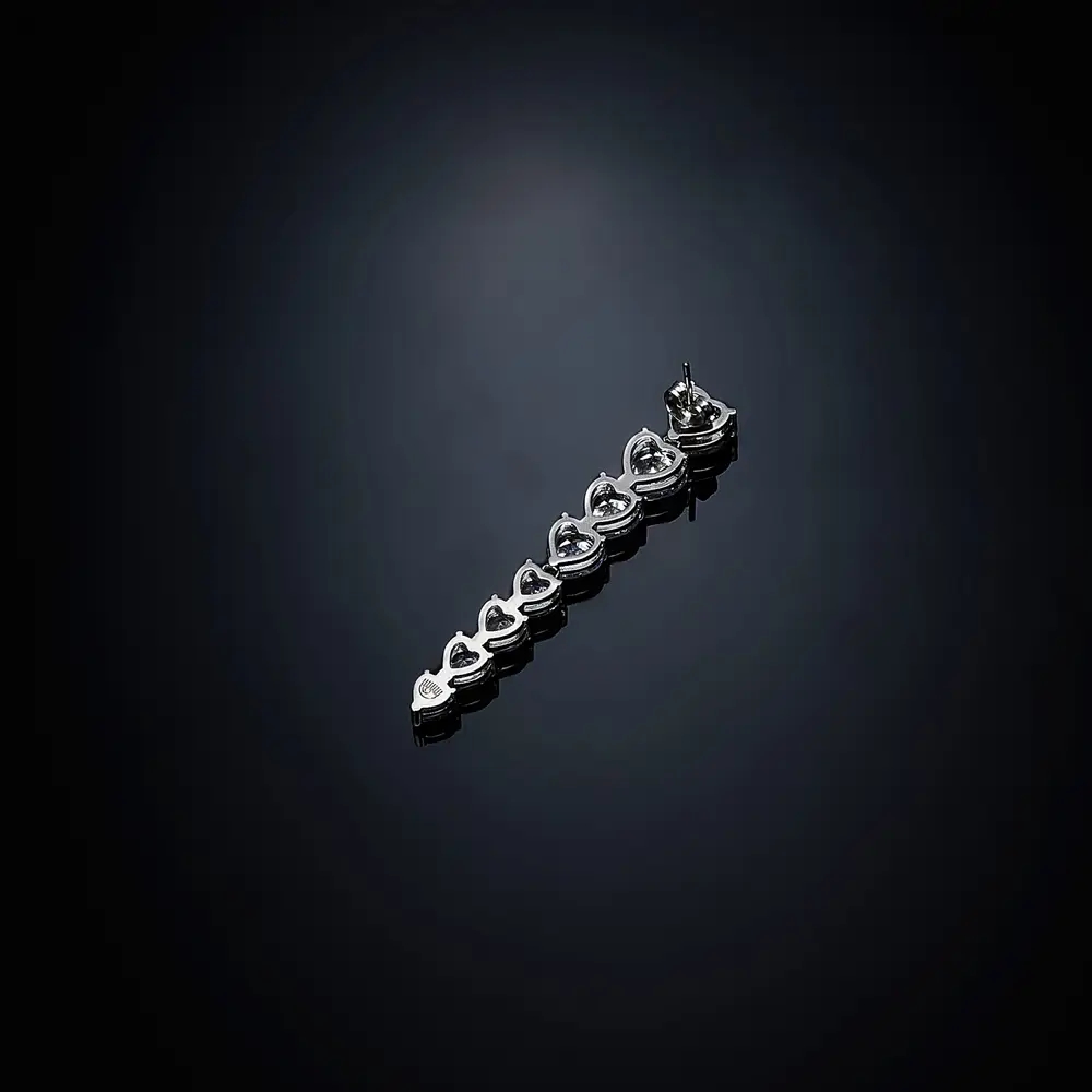 Il mono orecchino è placcato rodio in zirconi a forma di cuore posizionati in modo da donare un effetto a cascata.