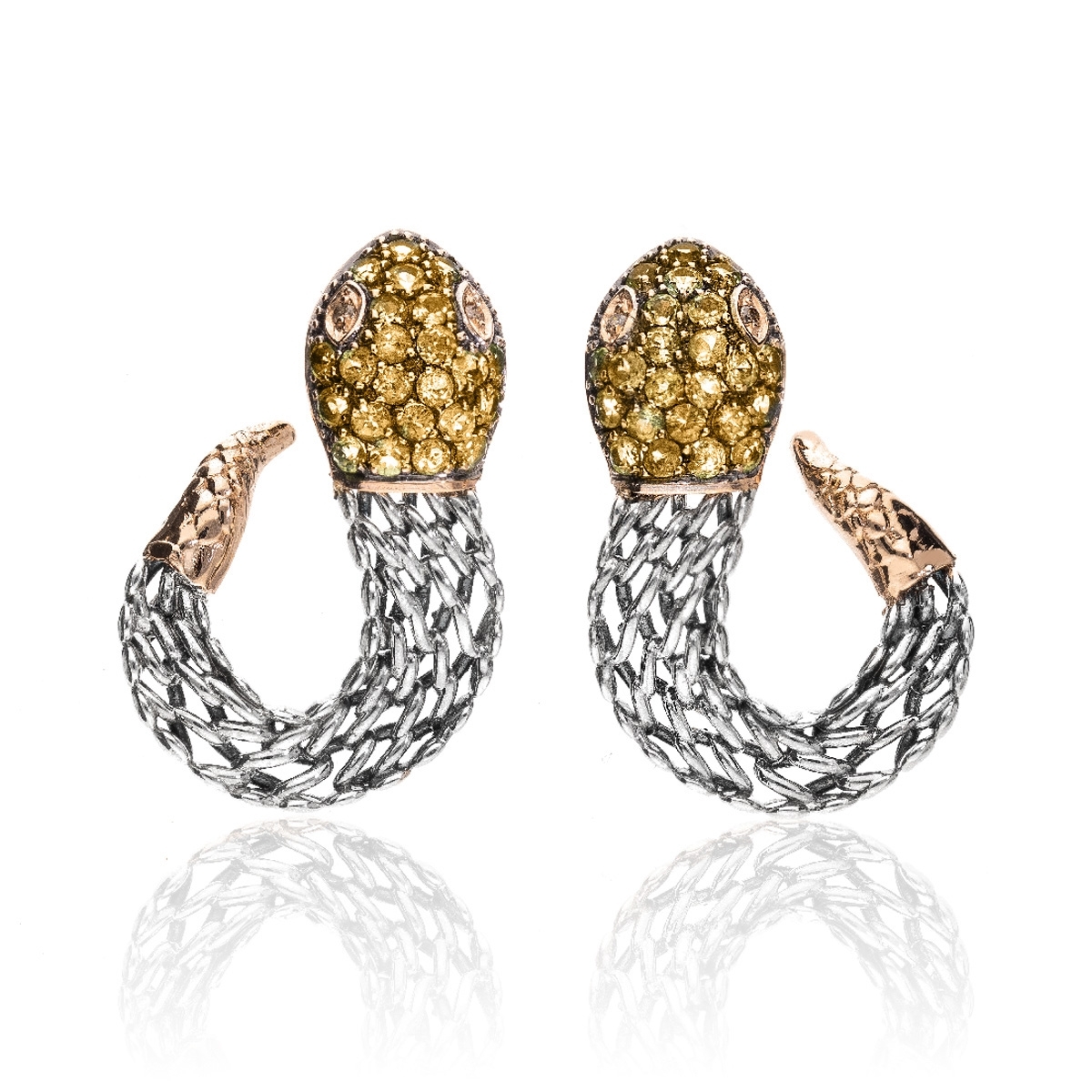 Orecchini realizzati a mano, esclusivamente nel laboratorio de' Nobili, in argento 925 e oro rosa 9kt con pavè di semipreziosi di citrino.