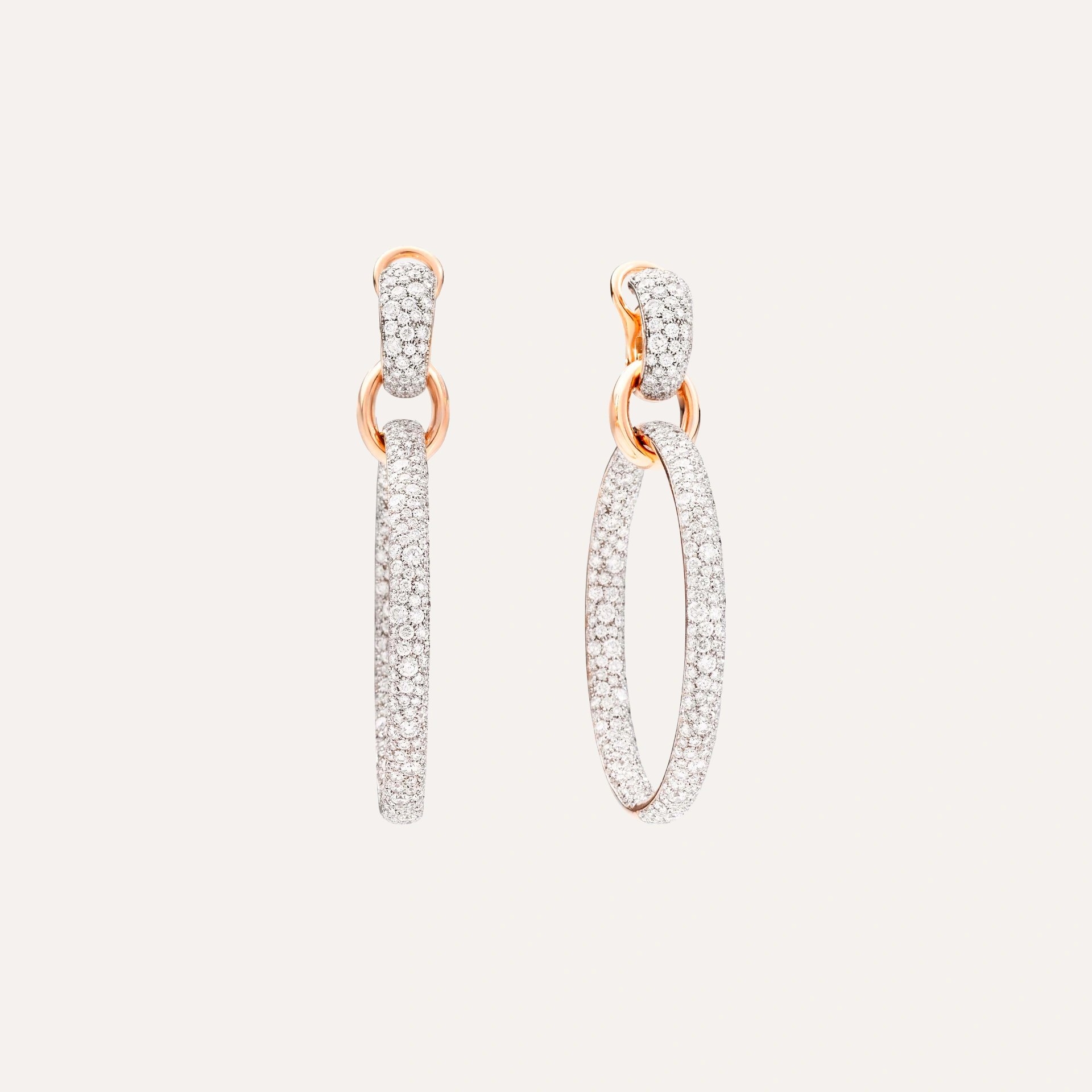 Esempio magistrale della lavorazione a catena, dal semplice modello a filo singolo alle creazioni di alta gioielleria, la linea Iconica propone orecchini a cerchio in oro rosa ricoperti da un pavé di oltre 600 diamanti montati in maniera apparentemente “casuale” per un effetto di abbagliante disinvoltura.