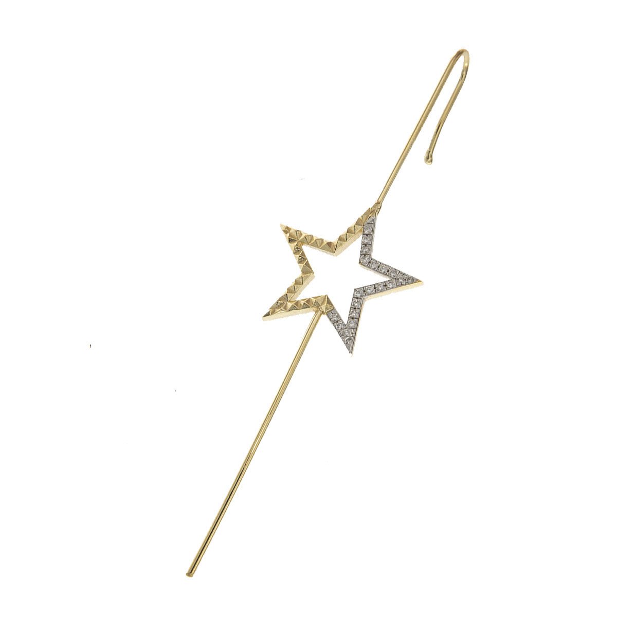Mono-orecchino hook con stella di zirconi e borchie. La forma ad uncino permette di inserire la parte bassa dell'orecchino nel foro del lobo, la parte si aggancia all'elice (non è necessario il foro in alto).