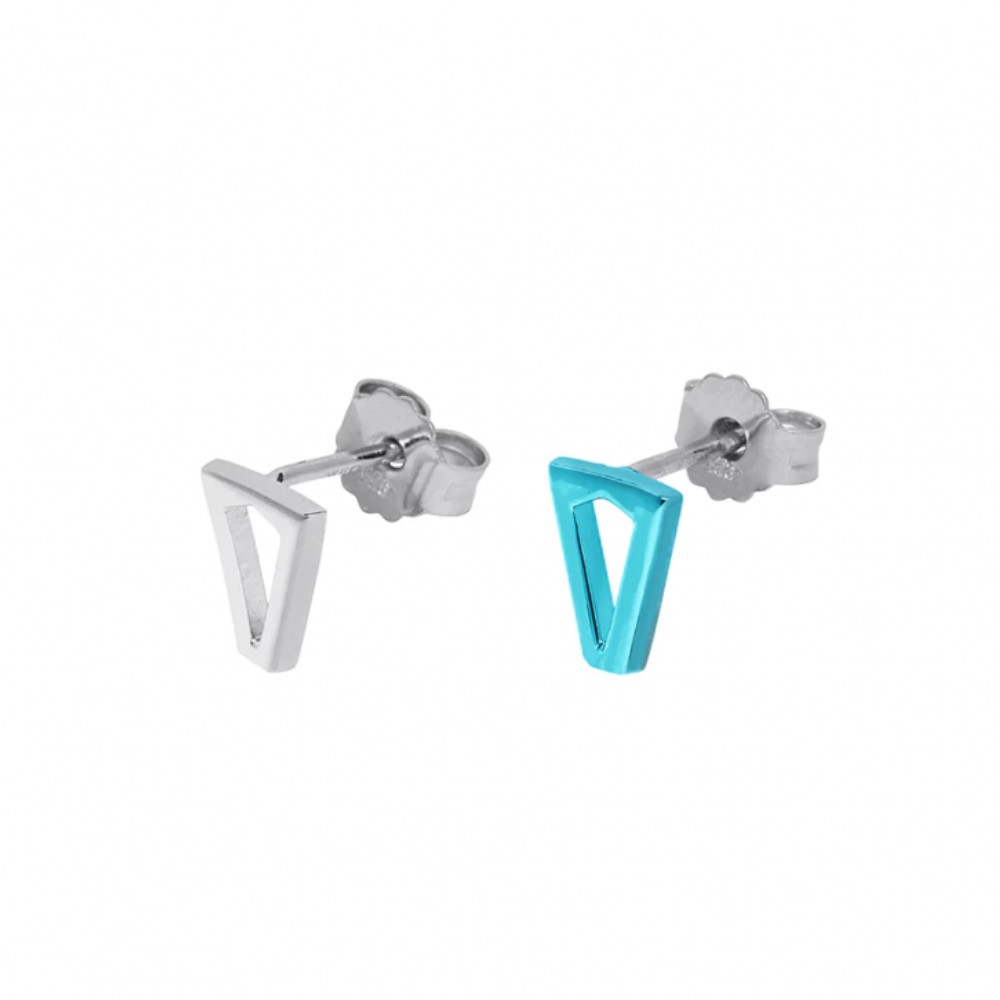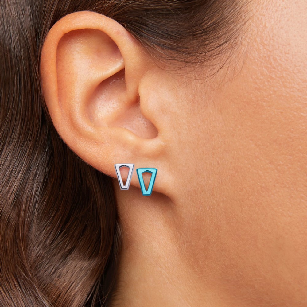 Gli orecchini sono in argento 925‰ con placcatura in platino e con vernice effetto metallizzato blu, caratterizzati da un forma triangolare che rappresenta la "V" di Valentina. Chiusura a perno.