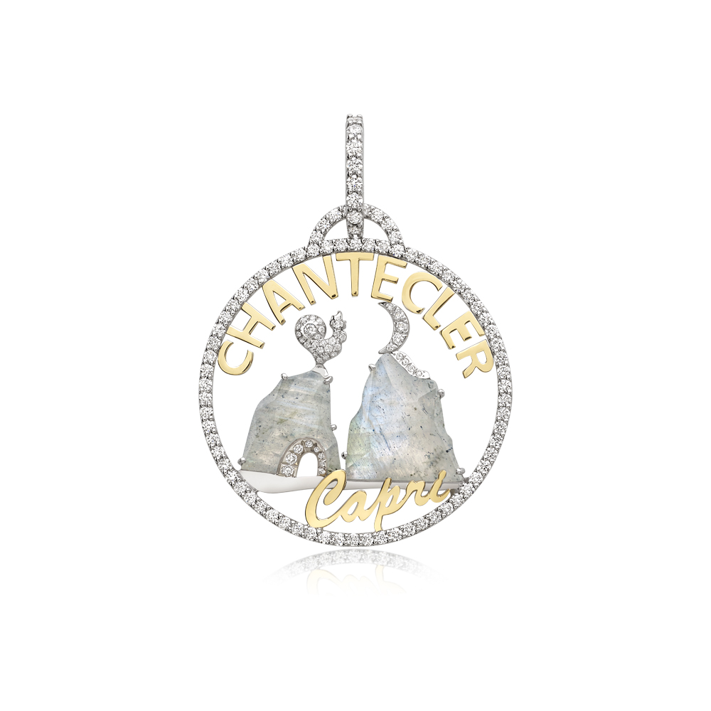Ciondolo piccolo in oro bianco e giallo18Kt , diamanti bianchi e labradorite, appartenente alla collezione Logo.