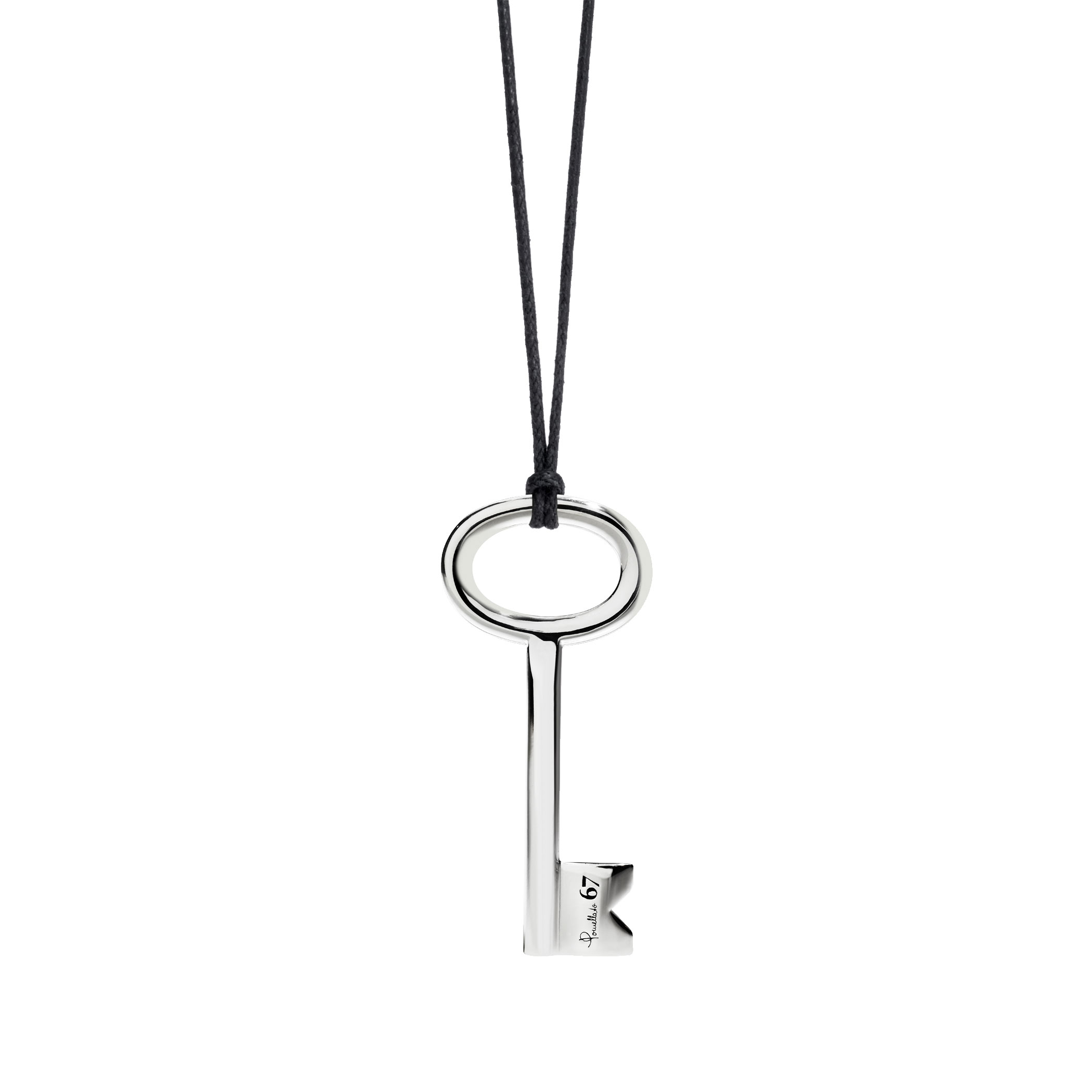 Questo pendente dal taglio essenziale e moderno, ha una forma di chiave che unisce diverse lavorazioni in argento.