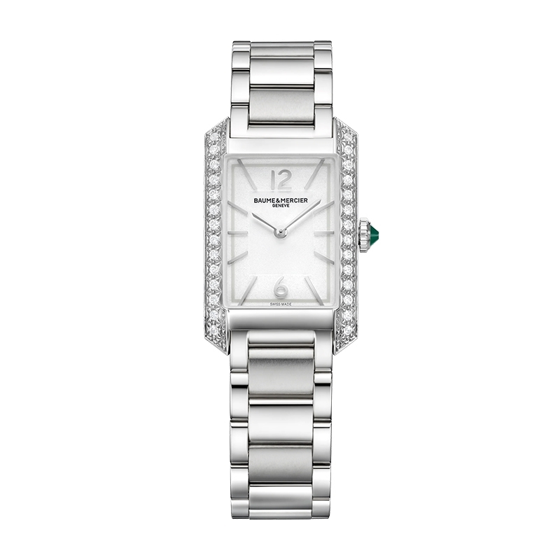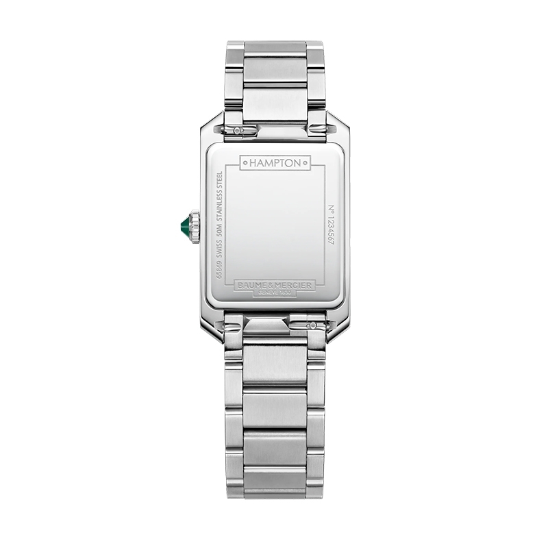 Il modello da donna Hampton 10631, dalla classica forma rettangolare, è declinato in acciaio e impreziosito da diamanti, animato da un movimento al quarzo e accompagnato da un bracciale in acciaio.