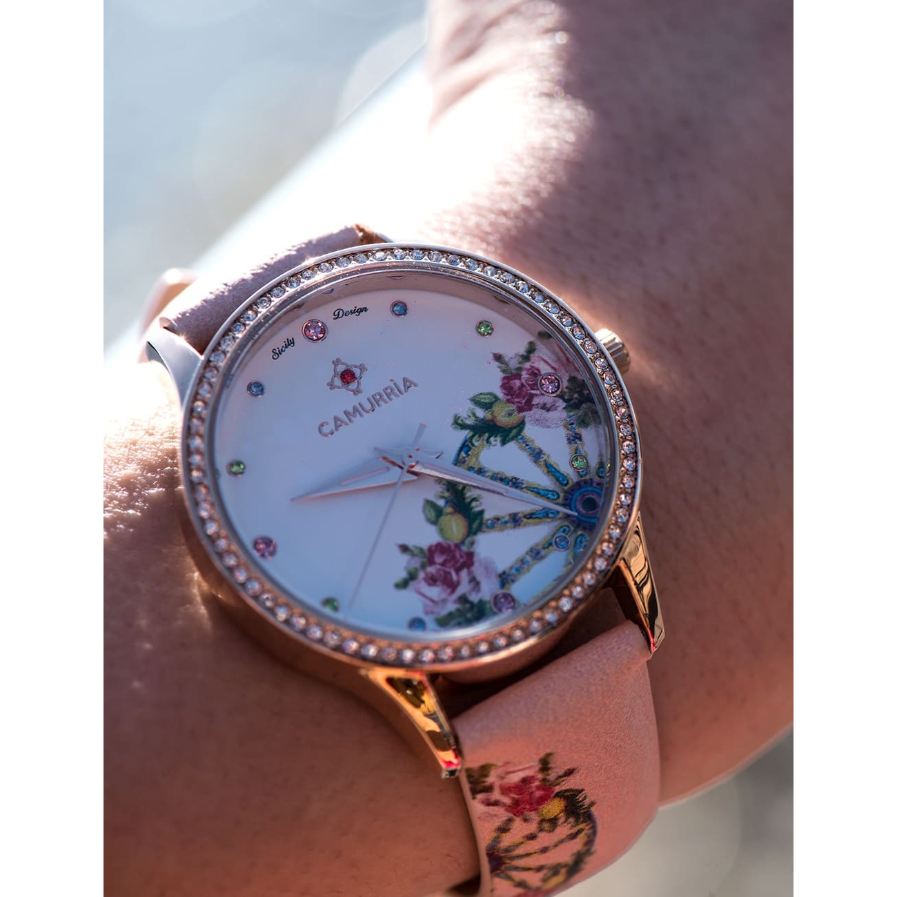 La linea 'A Rosa, della collezione A Tradizione, presenta l'orologio Glamour con cinturino in acciaio. Il quadrante dell'orologio Glamour in metallo lucido è con stampa siciliana e pietre applicate.