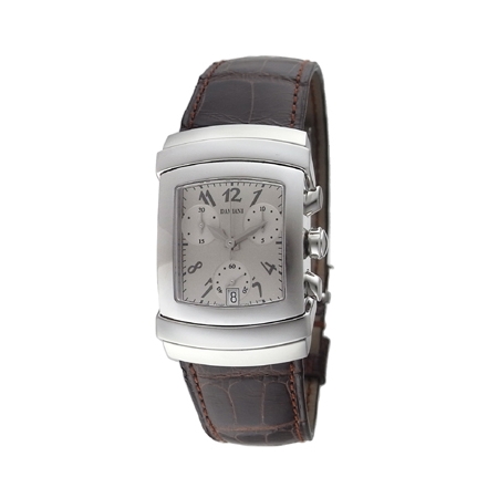 Cronografo a 3 contatori con cassa rettangolare galbé in acciaio di misura media.
