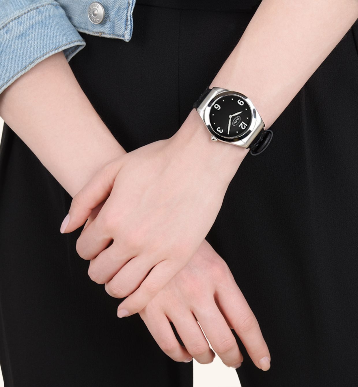 Cassa in acciaio diametro 37 mm con finiture in acciaio e lancette color acciaio.