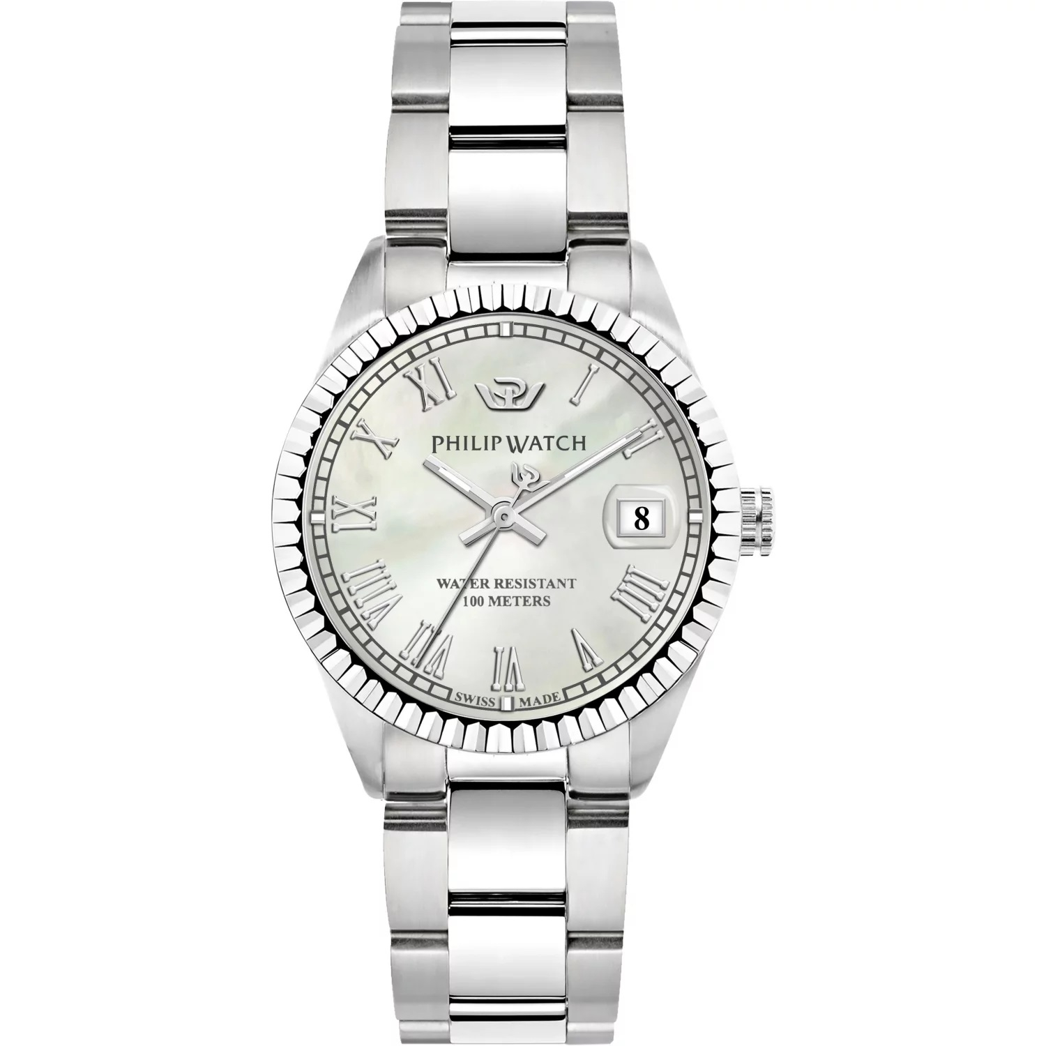 Orologio Philip Watch da donna con movimento al quarzo RONDA 503 e funzioni di solo tempo. Fa parte dell'acclamata collezione Caribe. La cassa realizzata in acciaio inox ha diametro di 35 mm con vetro zaffiro e quadrante in madreperla, indici a numeri romani e lancette silver; logo PW a mezzogiorno. Monta una ghiera zigrinata in acciaio. Il datario è posizionato alle ore 3. Il cinturino in acciaio inossidabile silver ha una pratica chiusura deployante con pulsanti. Questo orologio ha una resistenza all'acqua fino a 100 metri di profondità.