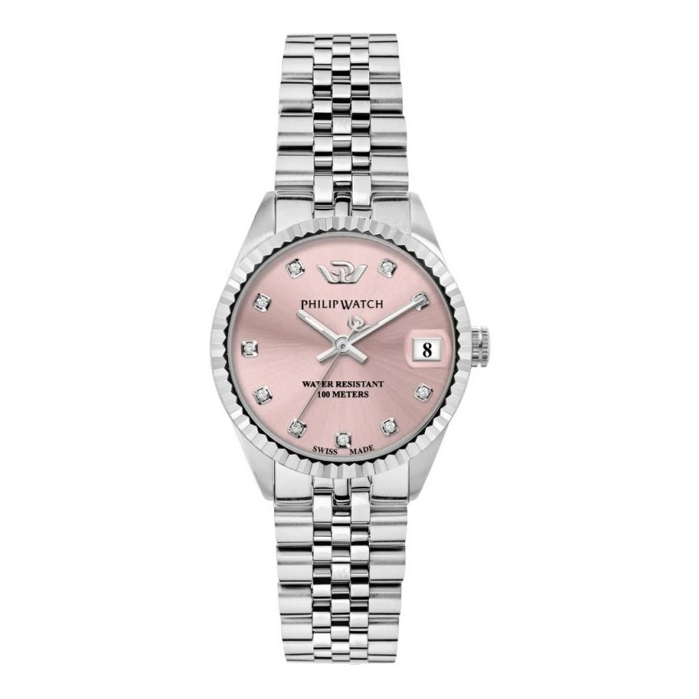 Quadrante analogico rosa con diamanti agli indici, logo a ore 12 e datario a ore 3 con lente di ingrandimento.
